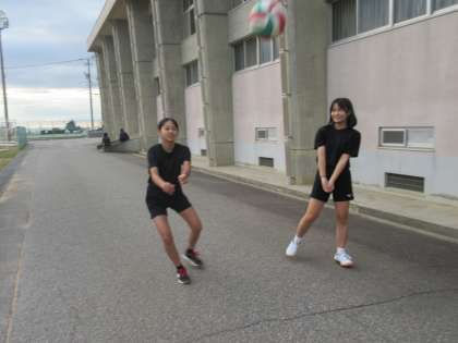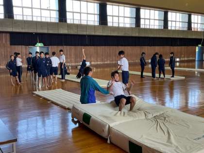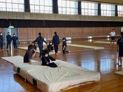 保健体育で、マット運動の前方倒立回転の練習に取り組んでいます。写真の上が1組、下が2組です。きれいに跳べるようになるまで、繰り返し頑張っています。