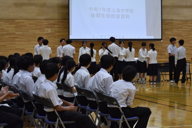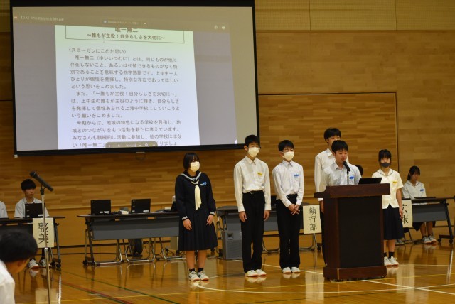 後期生徒会スローガン『唯一無二〜誰もが主役!自分らしさを大切に〜』の下、よりよい上滝中学校を目指し、唯一無二な生徒会活動を行ってくれることを願っています。