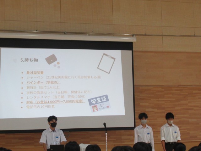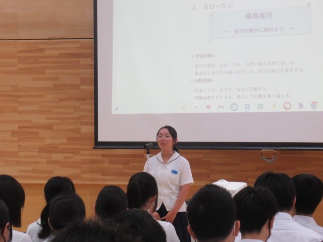 2年生は、明後日の校外学習に向けた結団式・出発式を行いました。結団式・出発式後は、学年プログラム委員から改めて約束事や持ち物の確認がありました。スローガン『華鳥風月~金沢の魅力に触れよう~』の下、様々な体験を通して金沢の魅力を発見してくれることを期待しています。