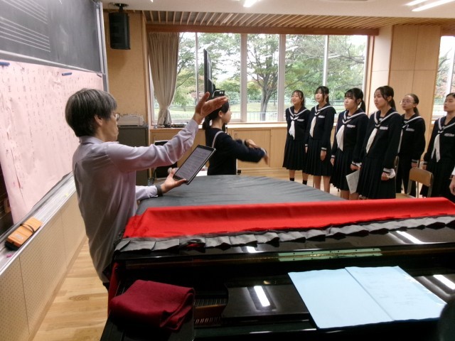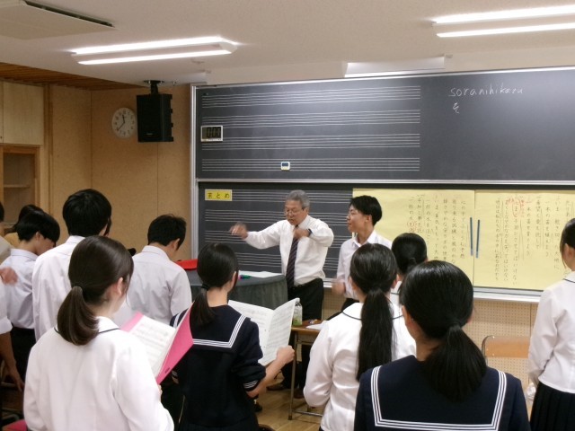 今年も、地域の合唱団「合唱団おおやま」谷崎千鶴さんがご指導くださいます。今日は2年生の2クラスを見てくださっています。