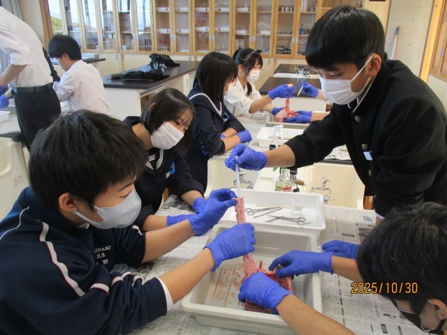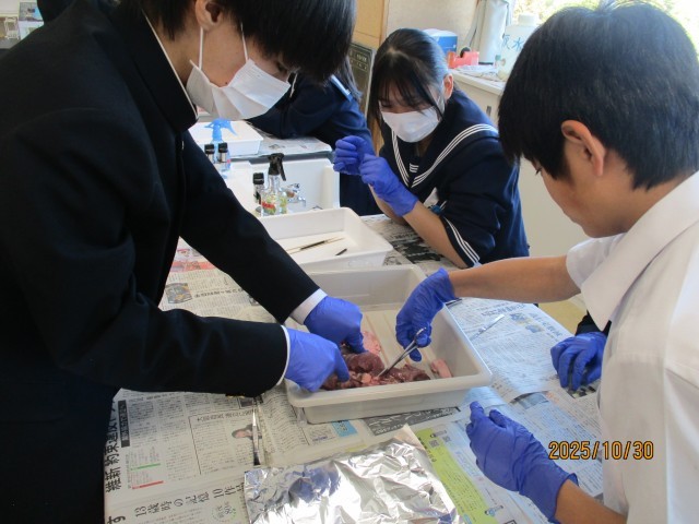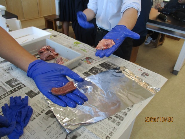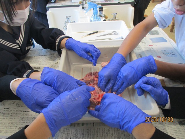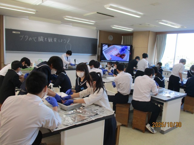 2年生の理科では、以前学習したヒトの心臓のつくりとはたらきを確認するために、ヒトの心臓に近いブタの心臓を用いて観察・解剖を行いました。