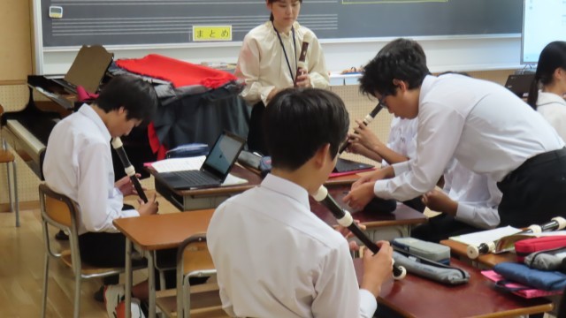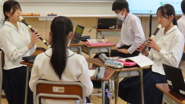 (写真中)2組音楽「高い音をきれいに出すにはどのような工夫が必要かな」