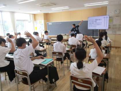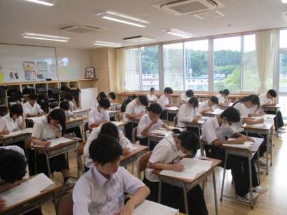 式辞では、校長から各教室の生徒に、この夏休みは何点だった?と問いかけがあり、生徒は手を挙げて応えていました。