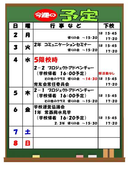 水、木曜日は2年生のプロジェクトアドベンチャー、金曜日は1年生の常西用水見学と、校外での行事を計画しています。該当の学年・学級は、終礼の時刻が変則的になります。
