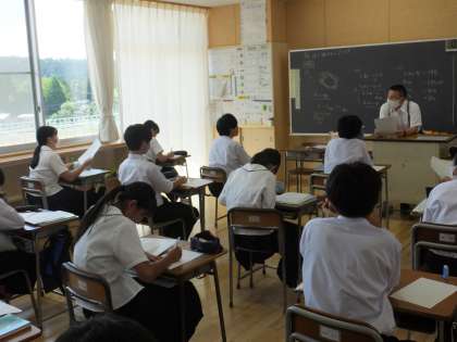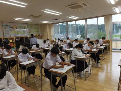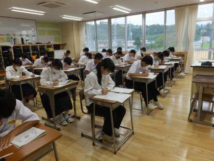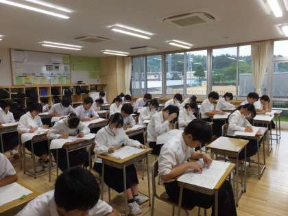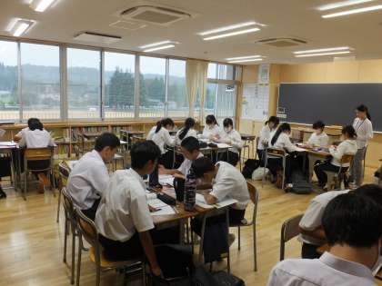 中間考査の答案が返され、解説を聞いて解き直しをしています。
