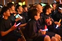1-1の体育科の授業のようすです。最初は照れくさそうにしていた生徒も、曲が流れると自然に体が動き出し、今では弾けるような笑顔が広がっています。