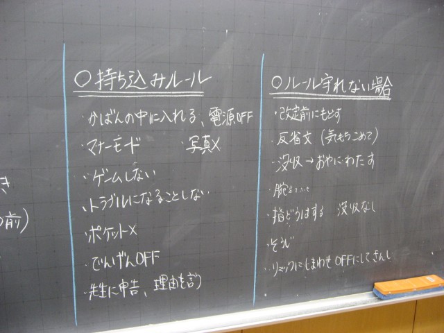 スマホ・ケータイについて、「目的(なぜ持ってくくる必要があるのか)」「使用できる場所」「使用できる時間」「持ち込みのルール」「ルールが守られない場合」について学級で意見を出し合いました。どのクラスでも活発な意見が交わされていました。