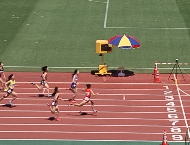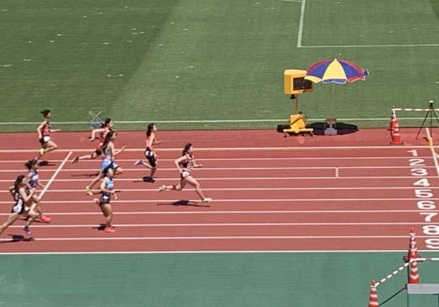 画像上段は、3年女子100mA決勝のゴール前の様子です。 本校選手は1位でゴールしました。 タイム12.55