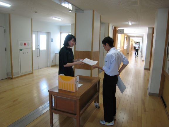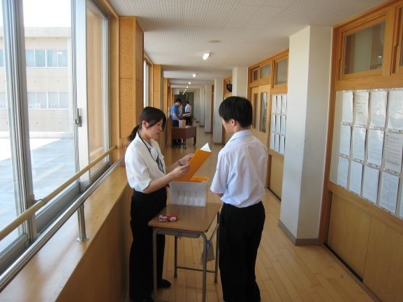 2年生1学期の最後の学活の様子です。担任の先生と、今学期を振り返って話しながら通知表を受け取っています。