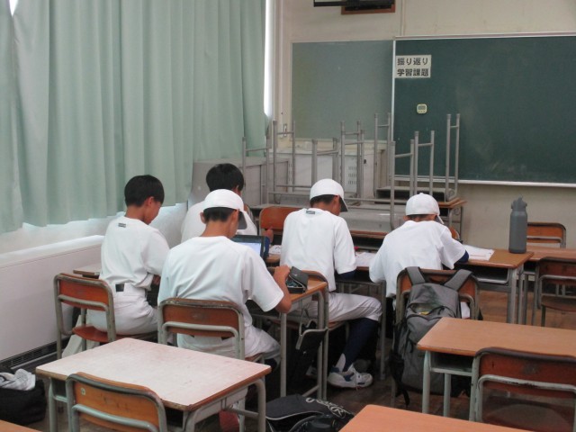 野球部は、グラウンドが涼しくなるまで、教室で課題に取り組んでいます。