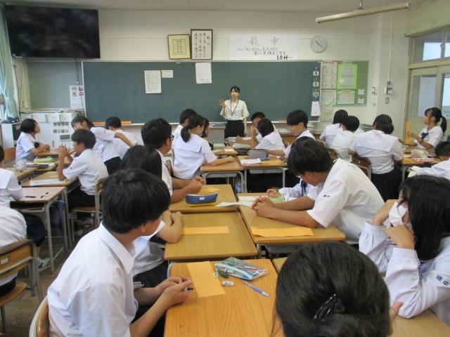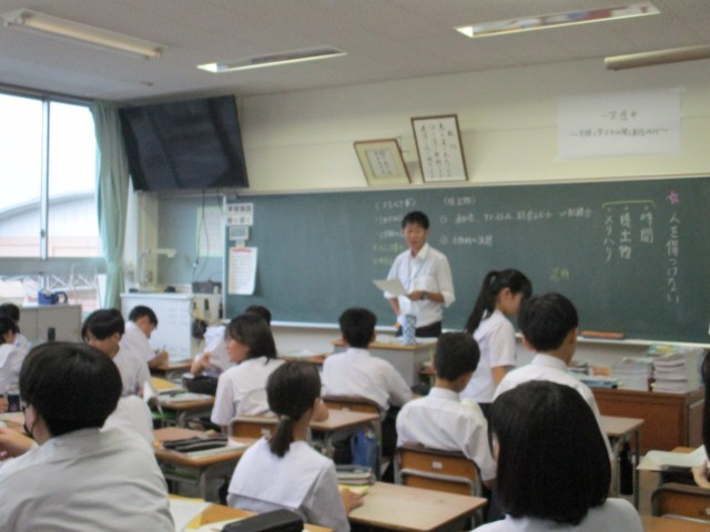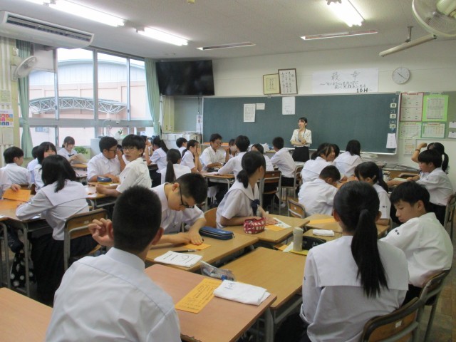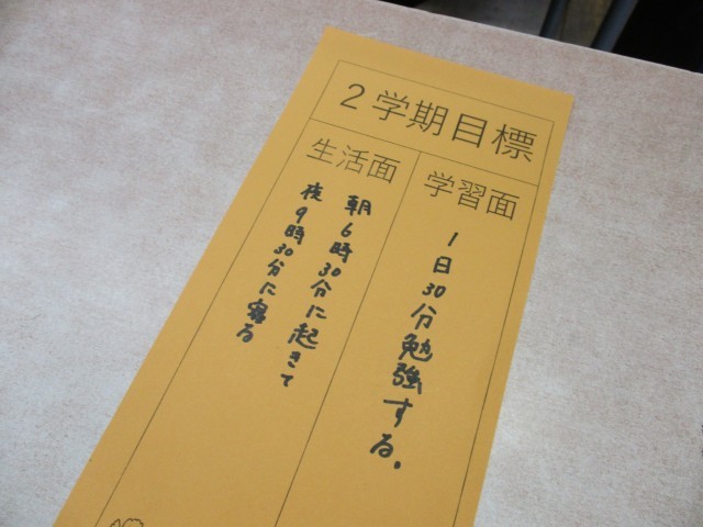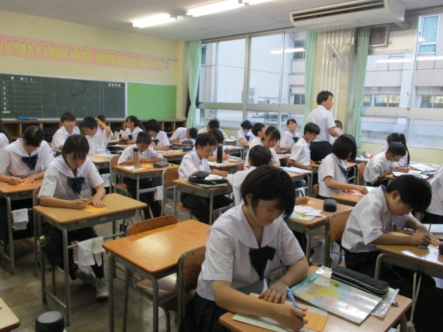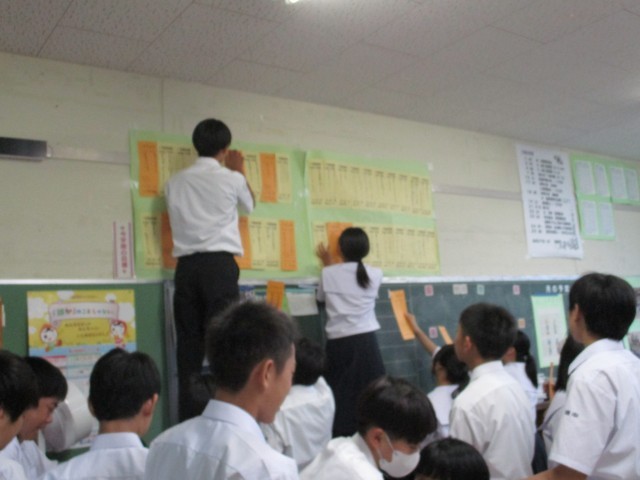 始業式を終え、2学期初の学活です。夏休みの課題を集めたり、2学期の目標を書いたりしました。