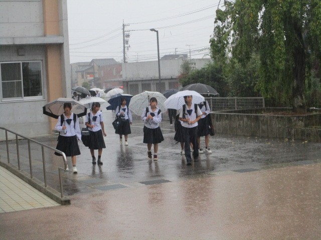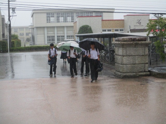 今朝の登校時は強い雨になりました。今日は3年生が確認テスト、2年生が夏休み明けテストを行います。本日の下校完了時間は16:55です。