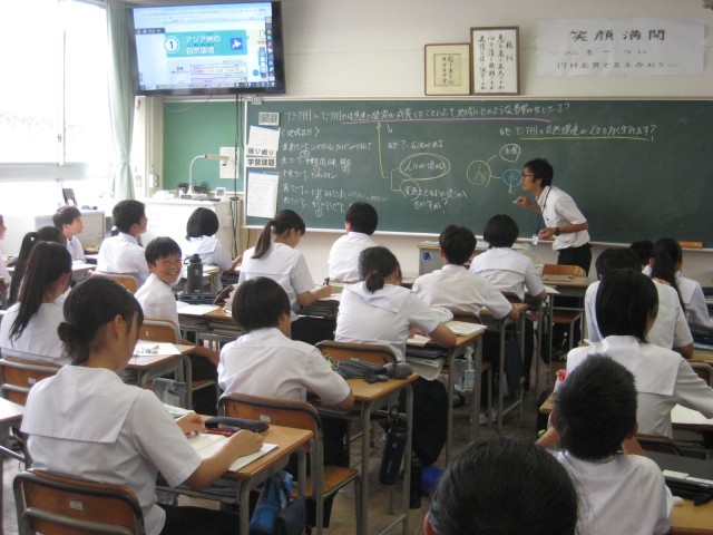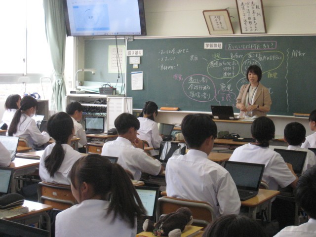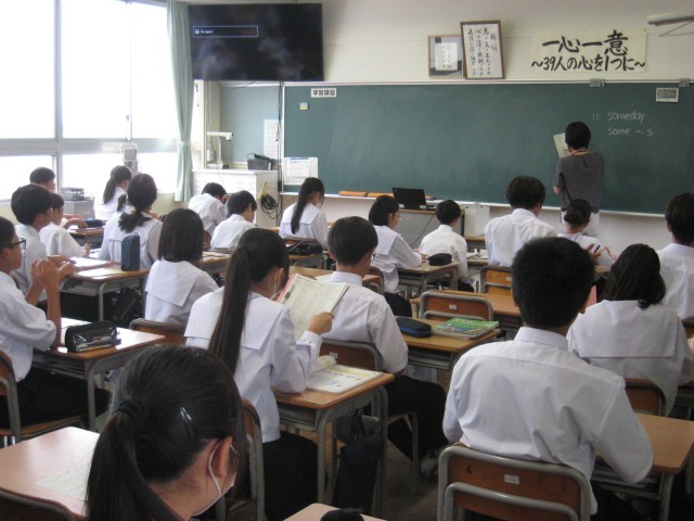 写真上から1組数学、2組英語、3組数学、4組理科、5組家庭科、6組保健体育、7組社会の授業の様子です。