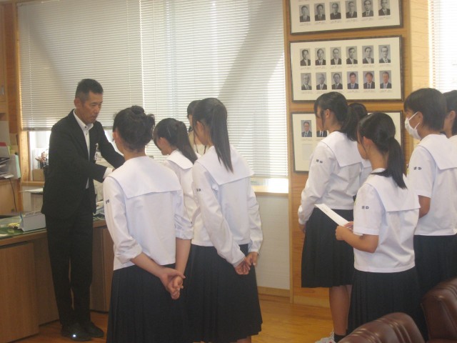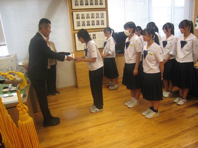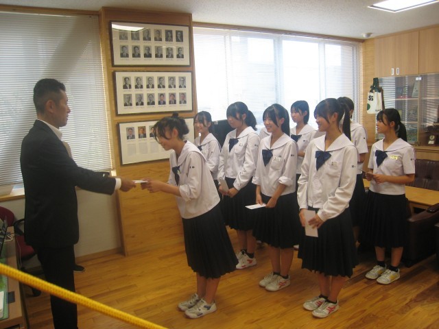 夏休み中に、全国大会に出場した部活動やクラブの選手に、教育振興会からの激励費を渡しました。