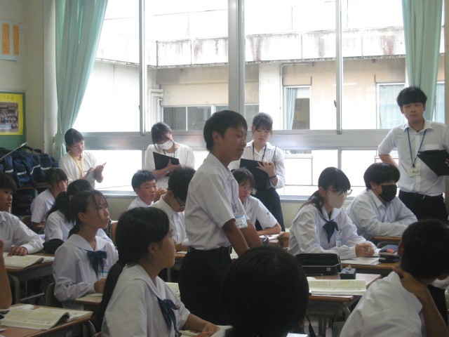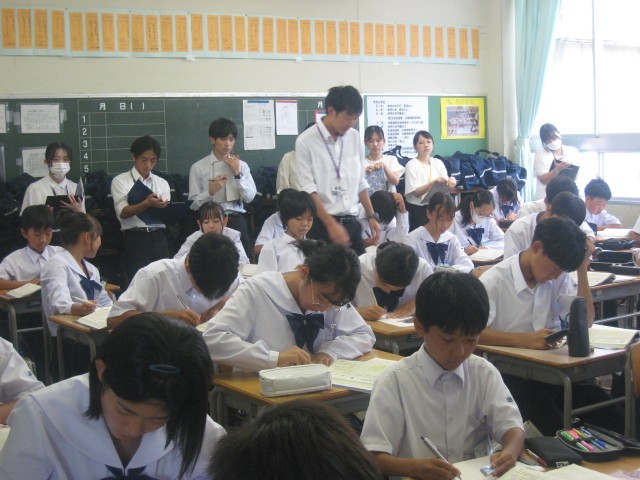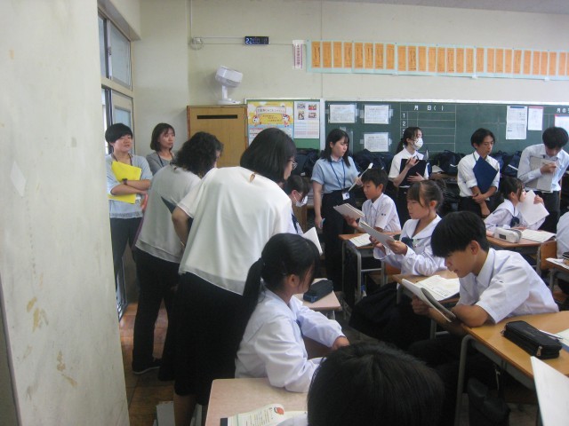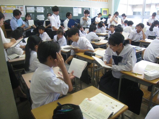 本日1年5組で、研究授業を行いました。他校の先生方もたくさん来ていただいている中でしたが、1年5組の生徒は、いつも通り元気に発表したりペア活動をしたりしていました。