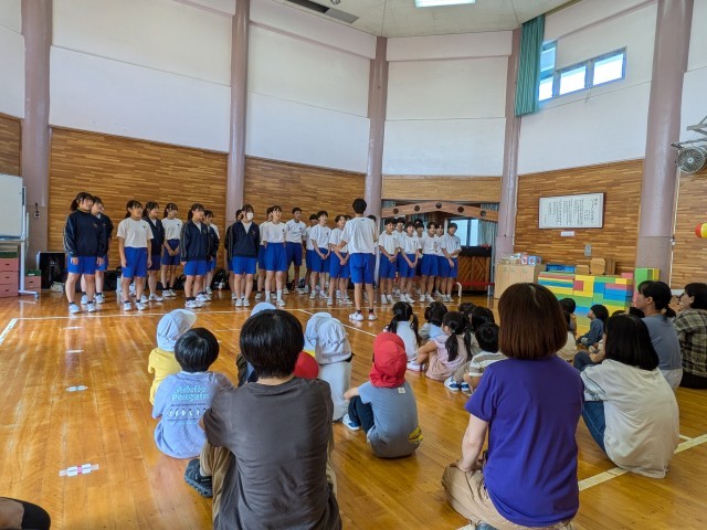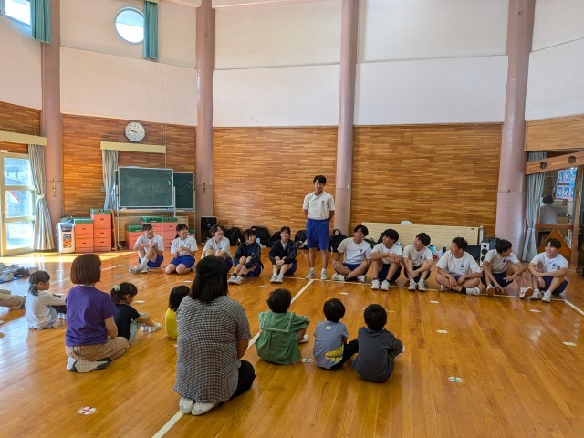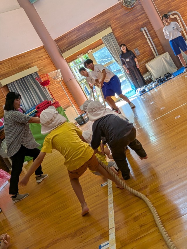 技術・家庭(家庭分野)の保育学習の一環として、中学生が乳幼児と直接かかわる体験型の学習「ふれ合い体験」として、速星幼稚園に行ってきました。綱引きや玉入れ、フォークダンスなど様々なアクティビティを通して、園児たちと交流しました。