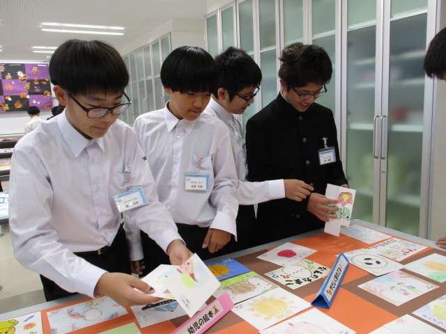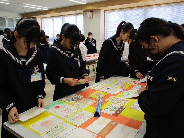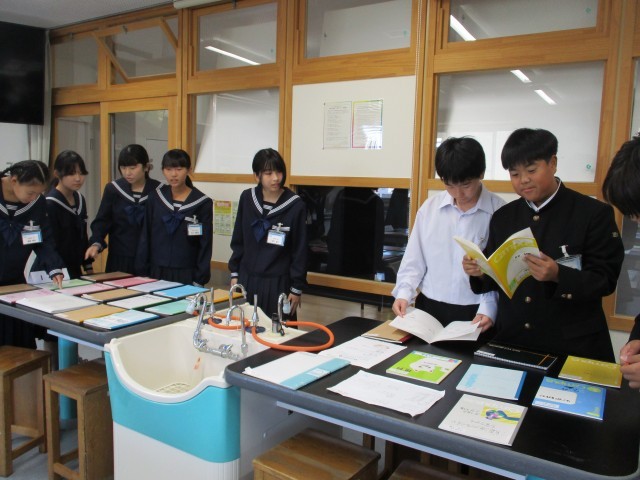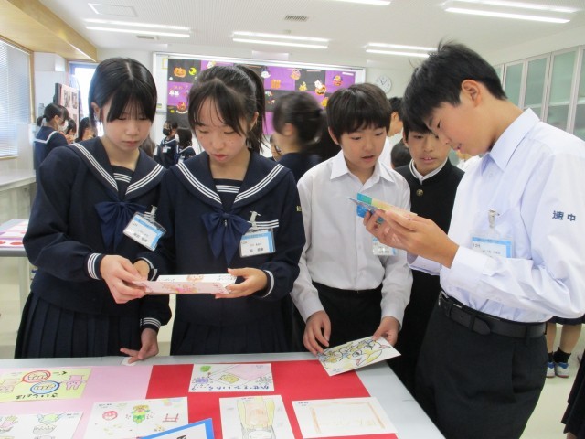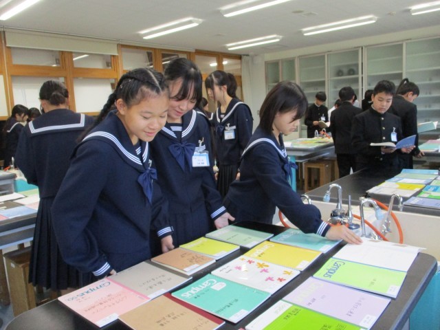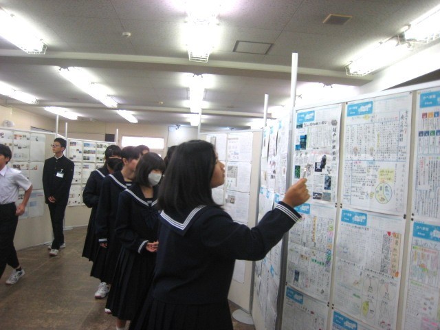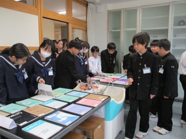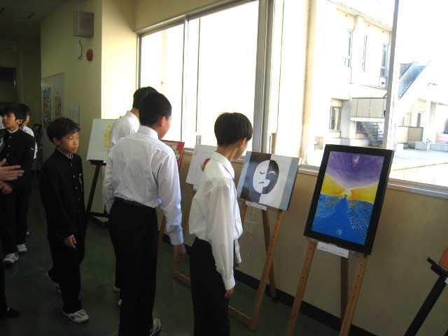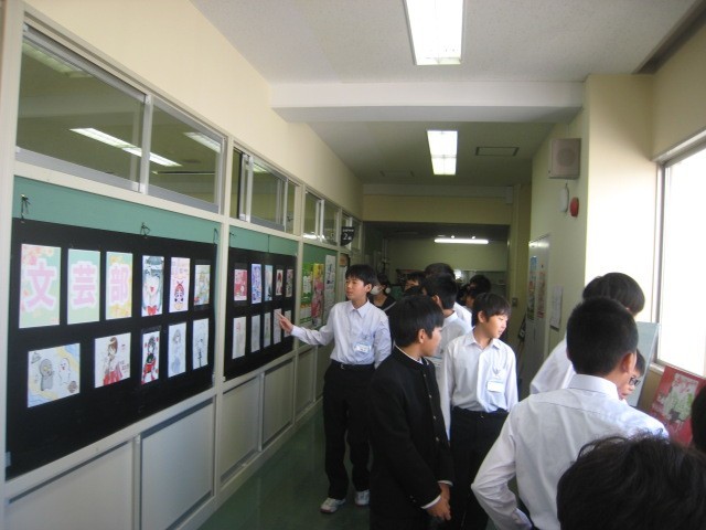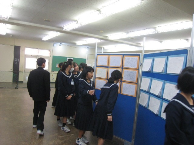 ステージ発表に続いて、展示見学をしました。科学作品・家庭科作品・美術作品、そして、書道部・英会話部・コンピュータ部など部活動の作品を見学しました。
