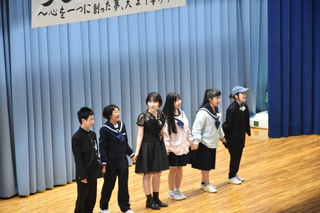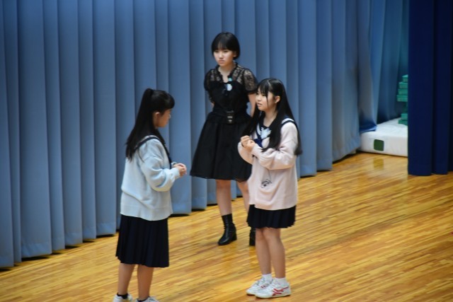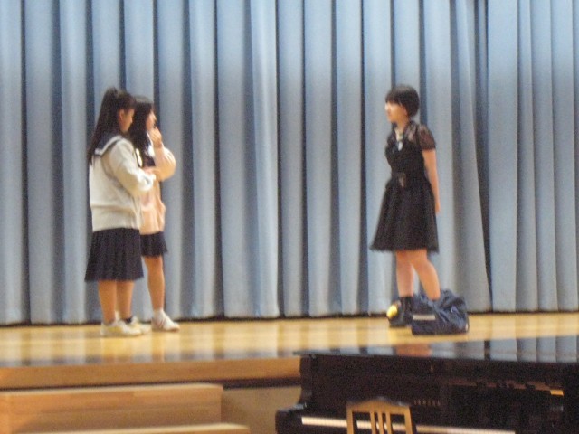 演劇部の発表です。市中文祭で発表した演劇「ナツミさんの憂鬱」を、全校生徒の前で披露しました。表現豊かに伸び伸びと演じ、照明や音響の生徒も自分の役割を確実にこなしました。友達の大切さや、付き合い方について、考えさせられる場面もありました。生徒たちは真剣に演劇を見ていました。