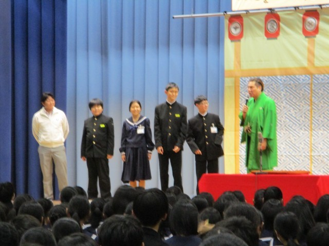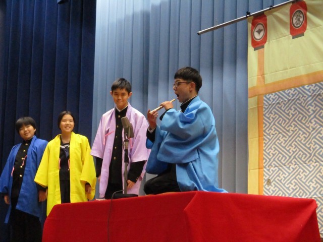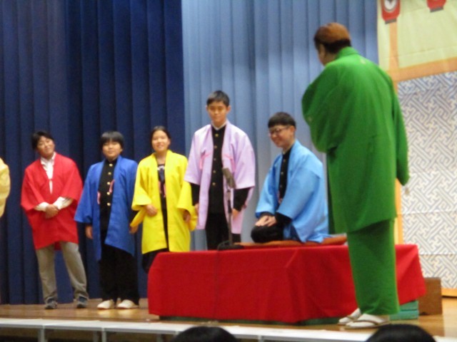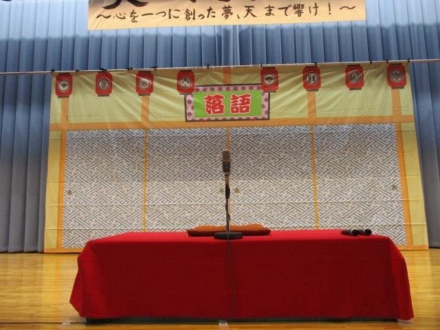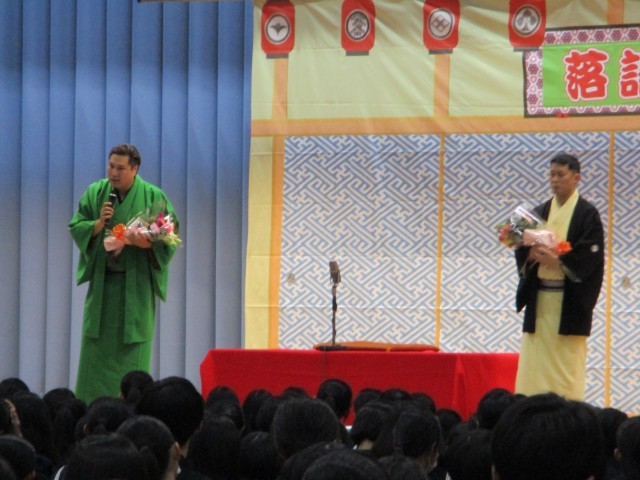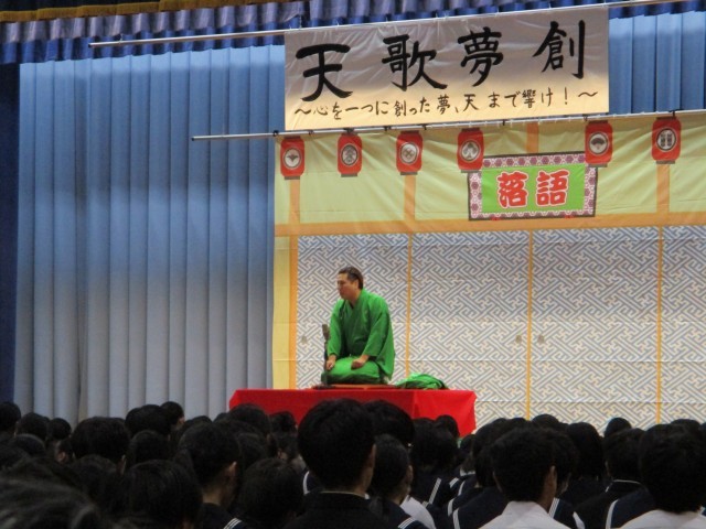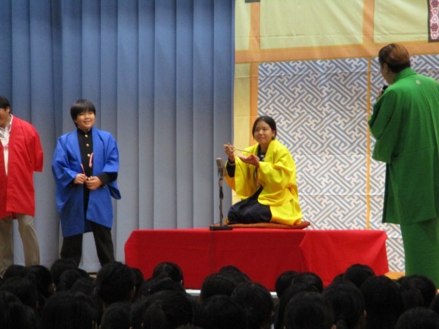 10月23日(木) 1年生 芸術鑑賞会 公開日 2025/10/23 更新日 2025/10/23 1年生 芸術鑑賞会は、『落語』でした。最初に落語教室があり、『落語』の基本的なことについて、わかりやすく説明を聞きました。落語の小道具である、てぬぐいと扇子の使い方や意味を教えていただきました。その後、実際に希望した生徒が数名ステージに登壇し、小道具を使って食べる動作を表現をしてみました。 +6