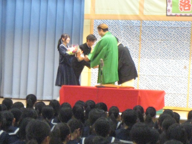 PTA文化委員会主催の「芸術鑑賞会」を開催しました。今年は「おもしろ落語鑑賞会」で、落語家さん2名をお迎えして落語の体験をしたり、落語を聞いたりしました。前半は、落語の所作や道具の使い方等、落語の楽しみ方についてお話しいただき、体験コーナーでは代表生徒や教員が小道具を使った所作を体験させていただきました。