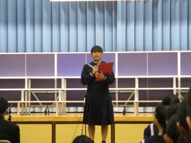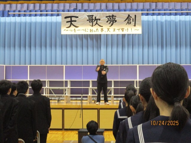 令和7年度の合唱コンクールがスタートしました。文化委員長の言葉に継いで、発声練習のため元気よく校歌を歌いました。