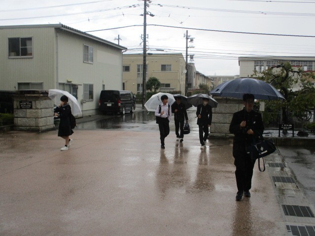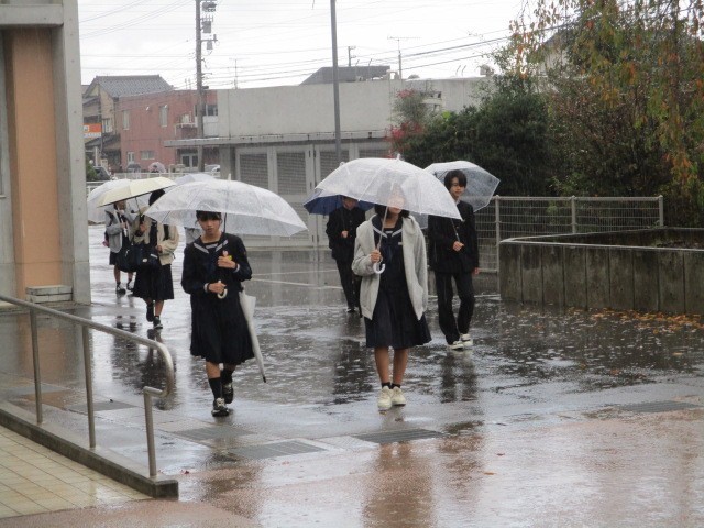 今朝の登校時は雨になりました。今日は5、6限に生徒総会を行います。本日の下校完了時間は16:55です。