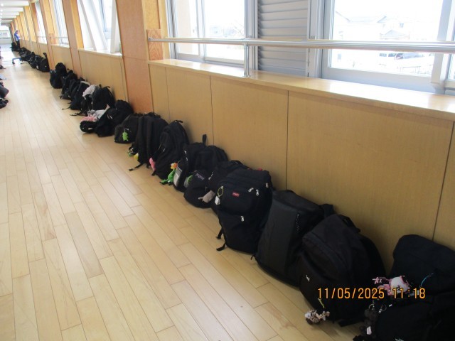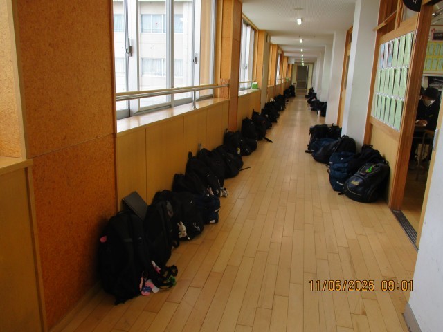 廊下を利用する人のことを考えて、荷物を整然と置いている2年生、そこに心遣いが見えます。ステキですね。