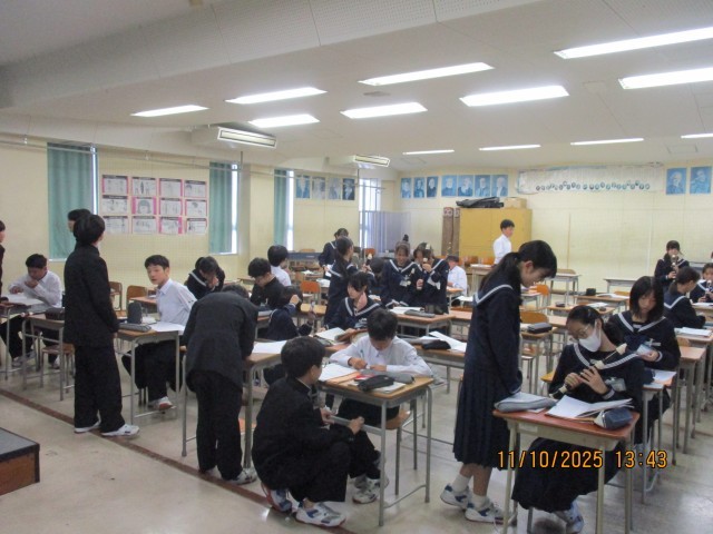1年生、5限の様子です。中教研テストが終わったばかりですが、今度は期末考査に向けてコツコツ学習を重ねてきます。