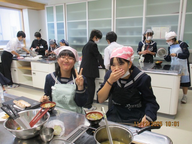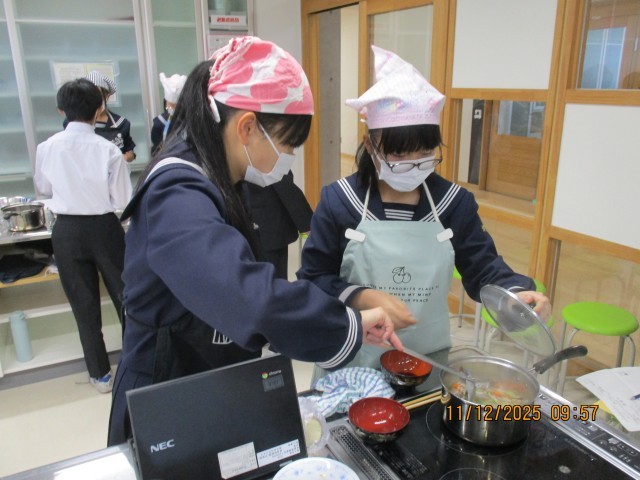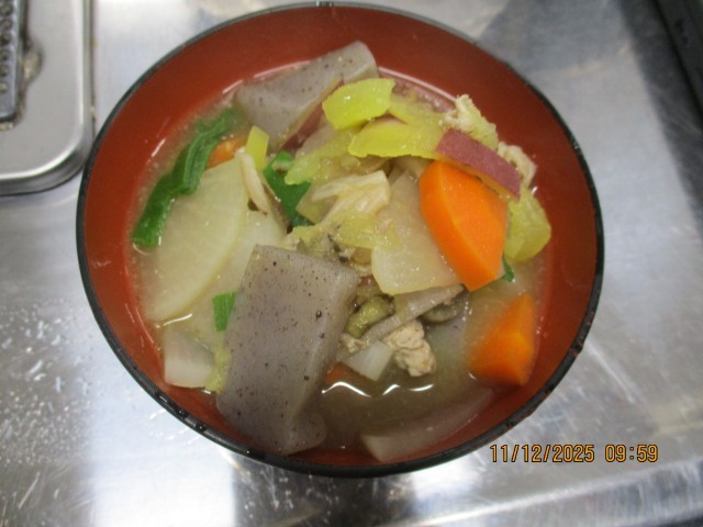 1年生では、「五感が喜ぶ豚汁づくり」を行っています。コーンや、油揚げ、さつまいも等、視覚や味覚を考えた五感が喜ぶ豚汁が今日もできあがりました。