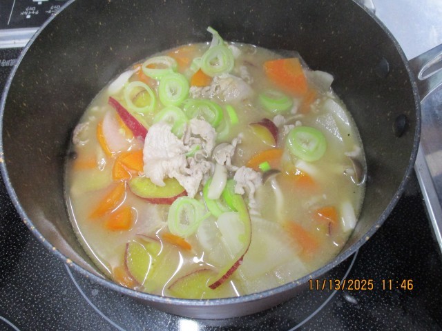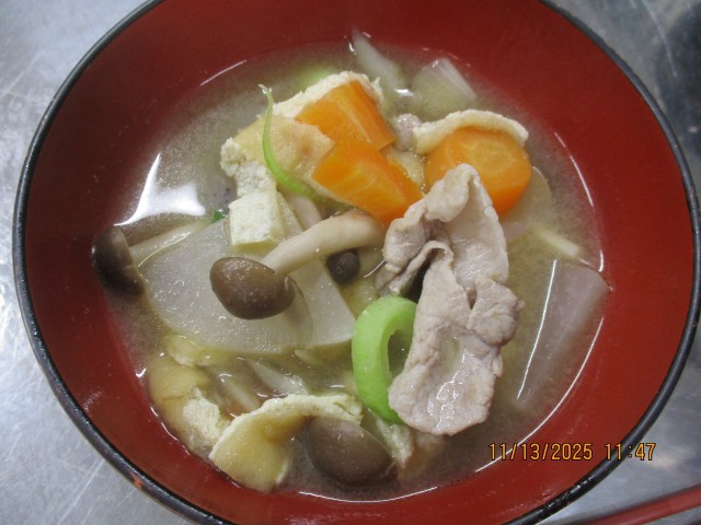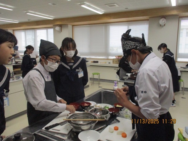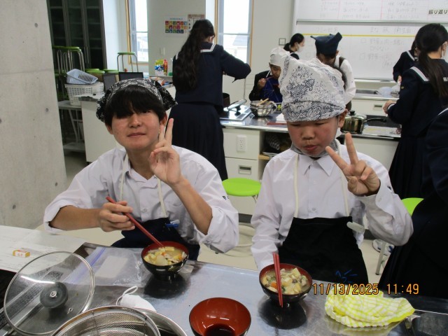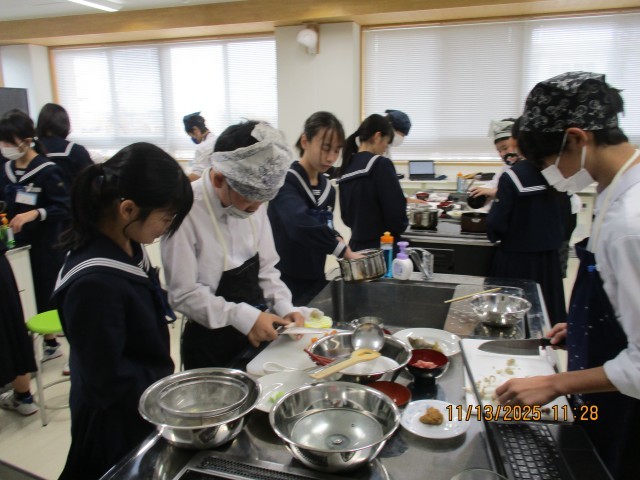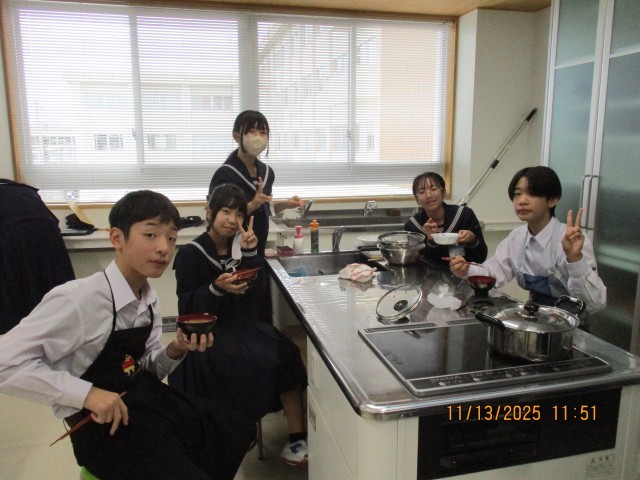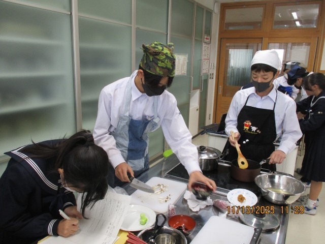 1年5組の調理実習です。今日は男子が実習に臨みました。朝の準備からてきぱきと動き、女子のアドバイスもあり、時間内に五感が喜ぶ豚汁を完成させました。女子もよく手伝いをしてくれ、ナイスチームワークでした。また、片付け後の机もピカピカでした。