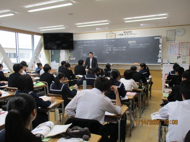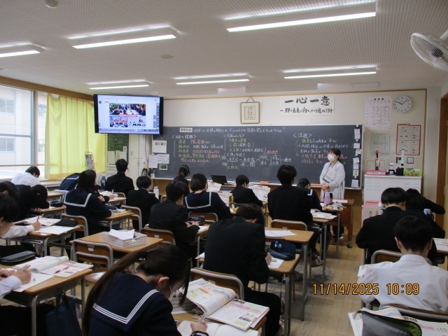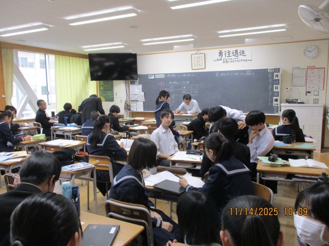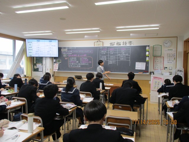 社会では重要用語をしっかりとメモを取っています。理科では、模範実験を興味深く観察しました。