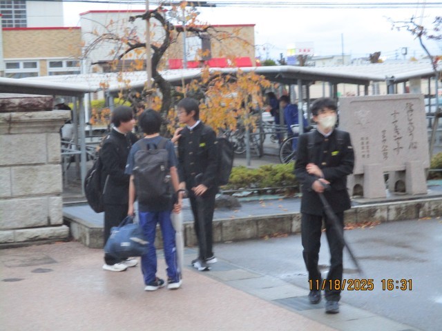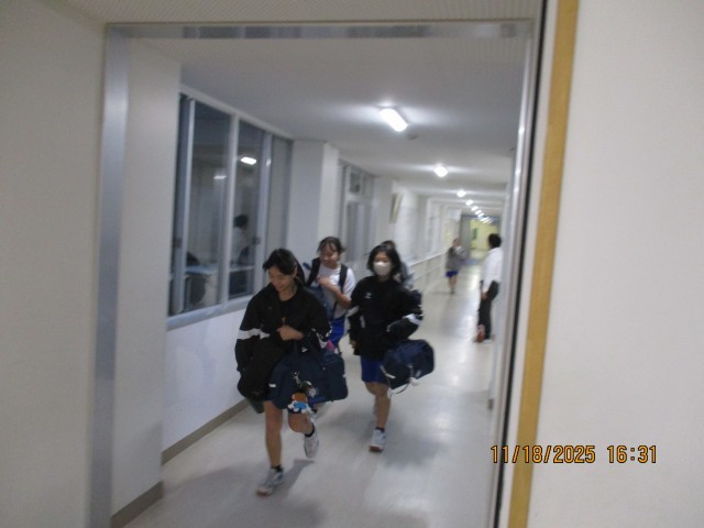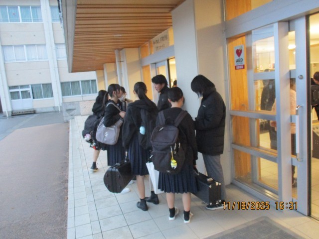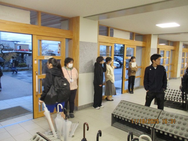 下校時刻の玄関の様子です。友達や先生と話す生徒、走って玄関に向かう生徒、元気よく「さようなら!」と挨拶する生徒等、にぎやかな玄関の様子です。
