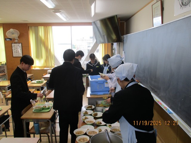 皆が楽しみにしている給食の時間です。給食当番が身だしなみをキチンと整えて、黙々と準備をしていました。また、お代わりをしにたくさんの生徒が前方に来ていました。毎日おいしい給食が食べられ、本当にありがたいです。