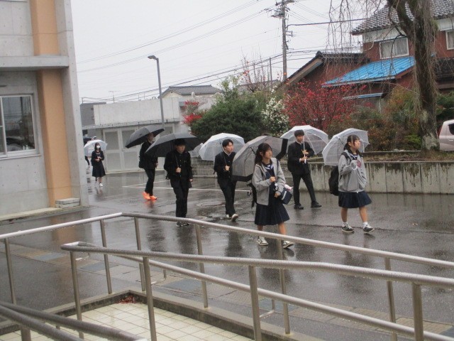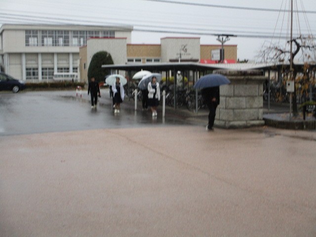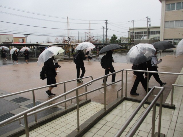 今朝の登校時は雨になりました。本日の下校完了時間は14:55です。