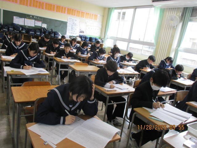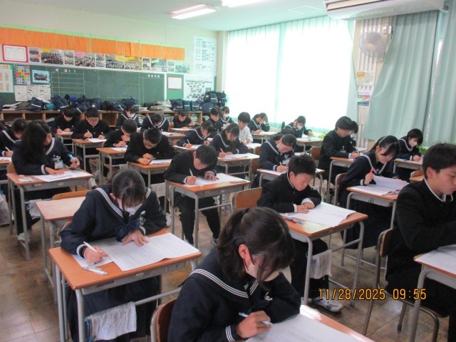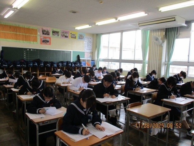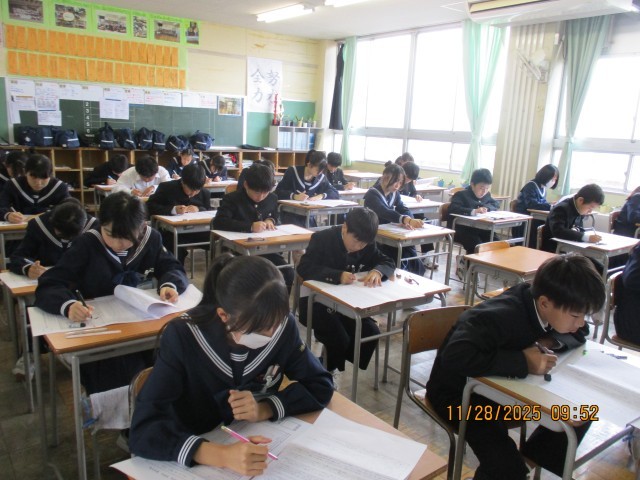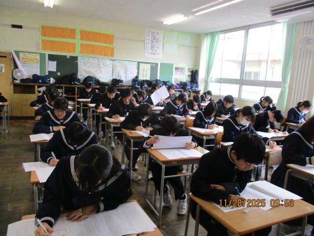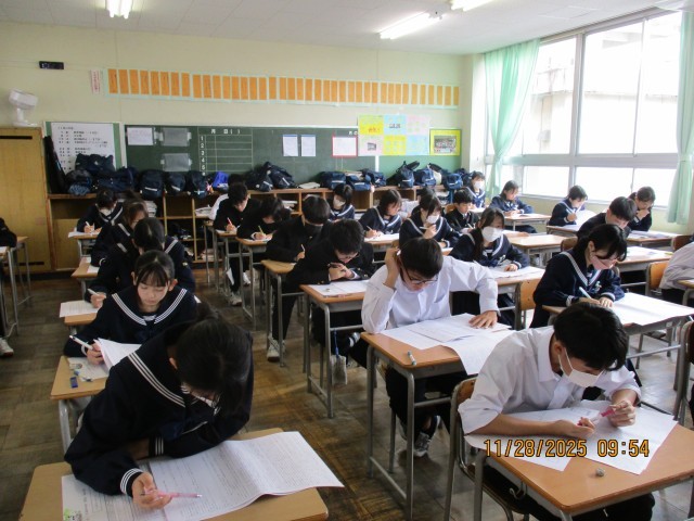 期末考査3日目です。教科は美術、社会、保健体育です。見直しまで含めて、時間をめいいっぱい使って取り組んでいます。