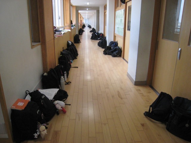 今日は第3回確認テストで、荷物等を廊下に置いて、机の中を空にしてテストを受けています。
