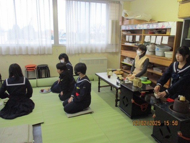 2枚目:茶道部は姿勢を意識して、指導の先生の話を聞き、活動しています。