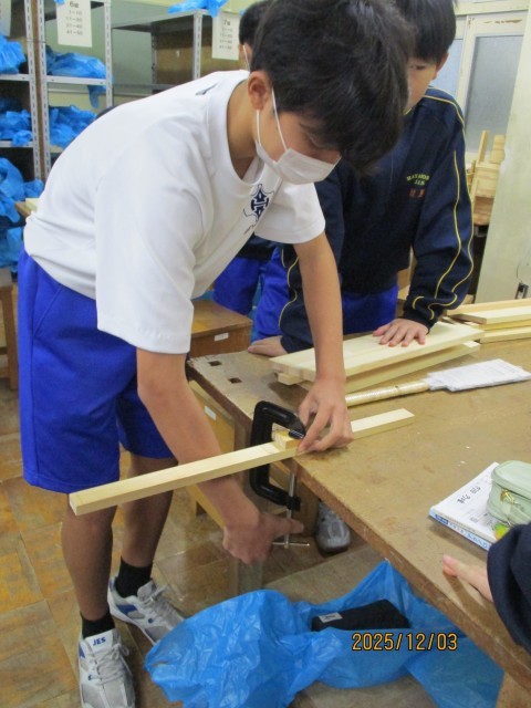技術科では、いよいよ、のこぎりを使って木を切る授業が始まりました。のこぎりの刃の特徴やのこぎりを使うときの注意事項、のこぎりの使い方などの説明を聞いたあとで、実際にのこぎりを使って木を切りました。木が動かないようにC型クランプをセットして、木を切ります。きれいに切り終わったときには、安心と嬉しい表情が見られました。