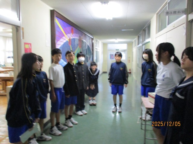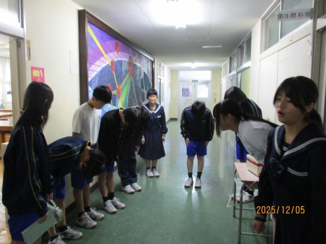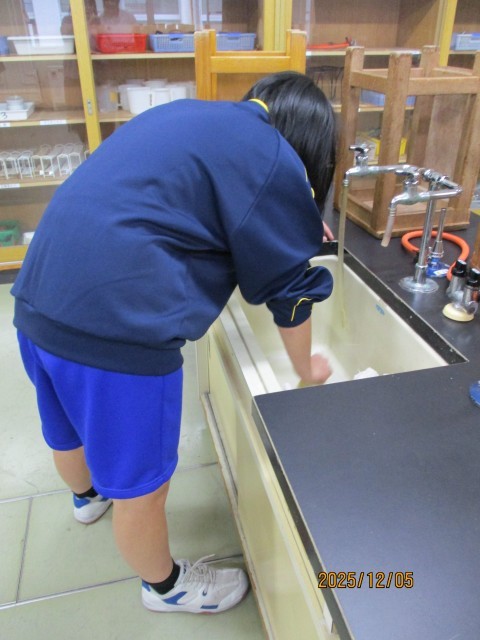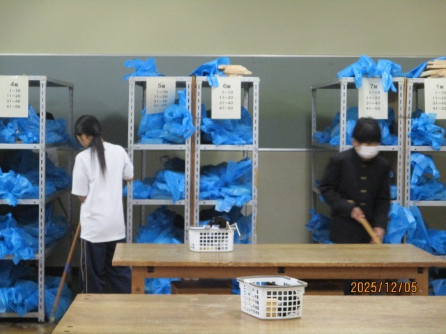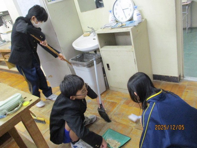 12月5日(金) 1年生 清掃時間 公開日 2025/12/05 更新日 2025/12/05 1年生 理科室清掃では、雪が降る寒い日でしたが、各テーブルの洗面所を丁寧に磨いていました。木工室清掃では、のこぎりを使った授業があり、たくさんの木くずがありましたが、隅々まで掃き掃除をしていました。清掃終了時には、班員全員がそろって、終了のあいさつを行っています。 +3