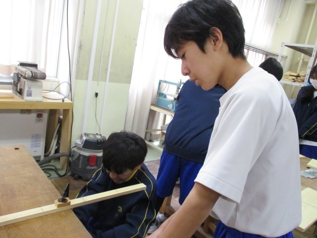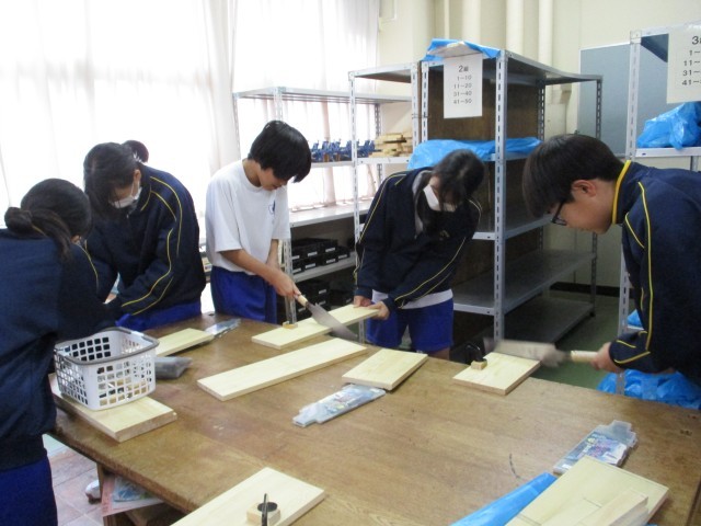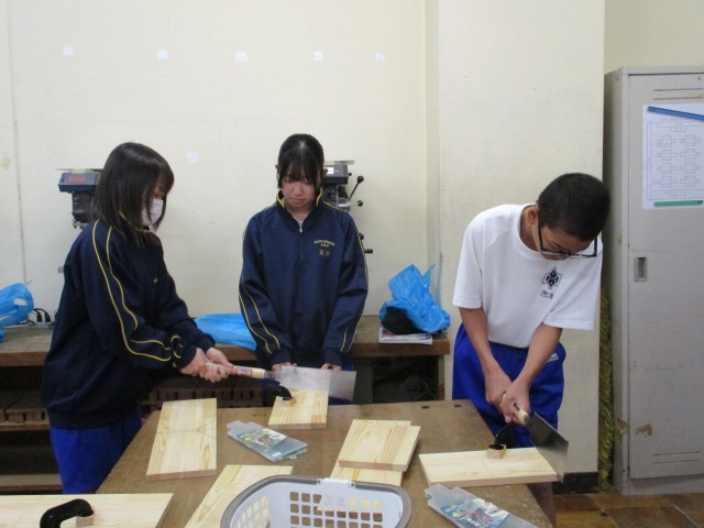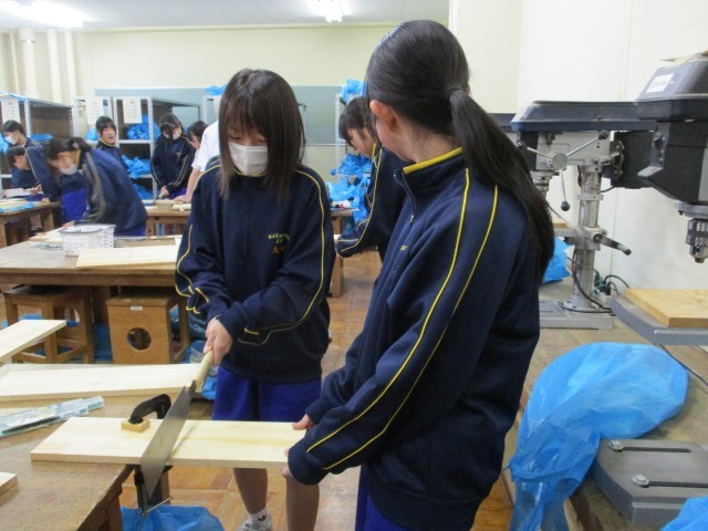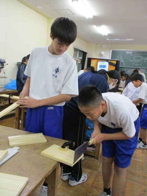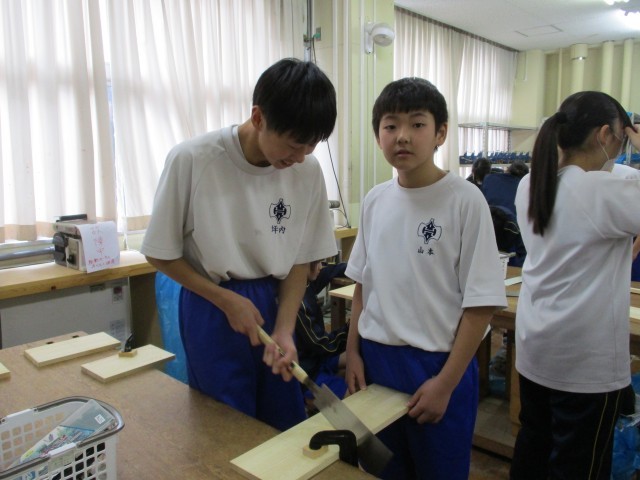 のこぎりの授業も2回目となり、班ごとに安全に気を付けて、のこぎりで木を切っています。自分で印をつけた個所を丁寧にのこぎりで切っています。