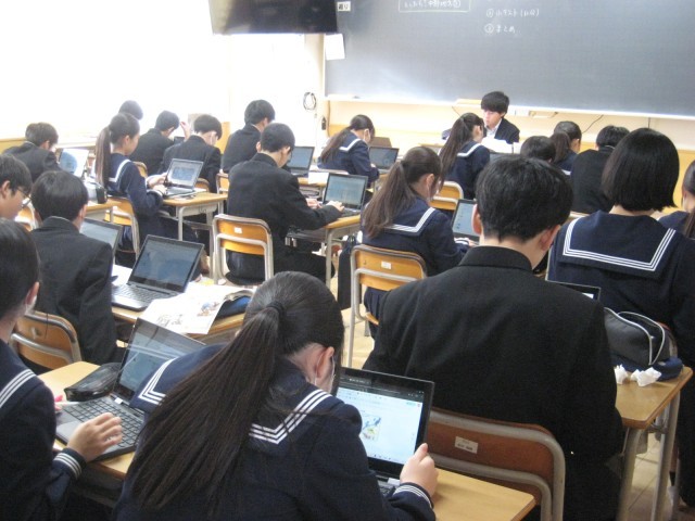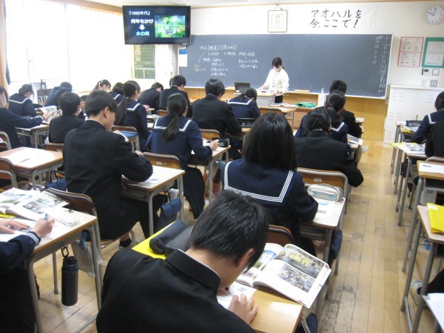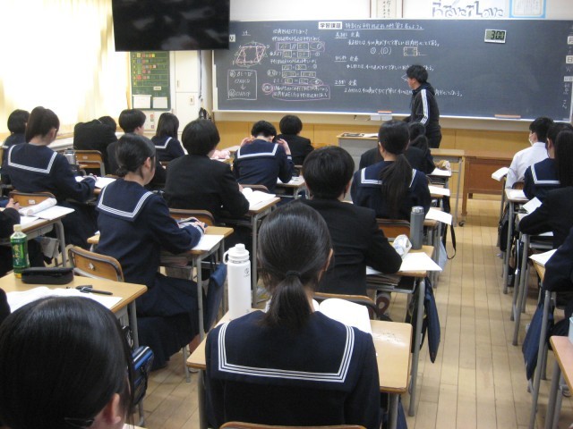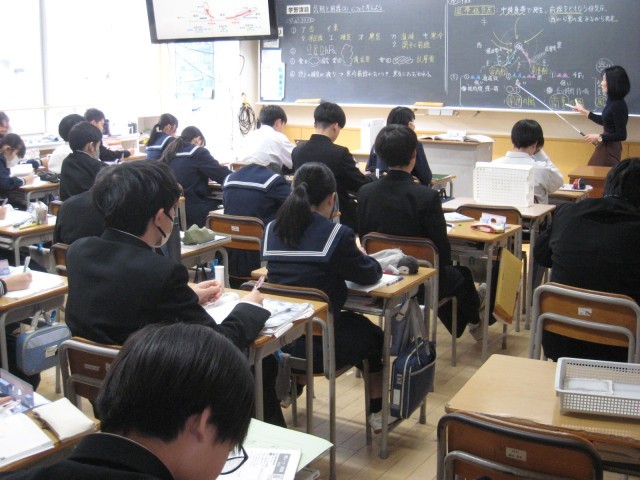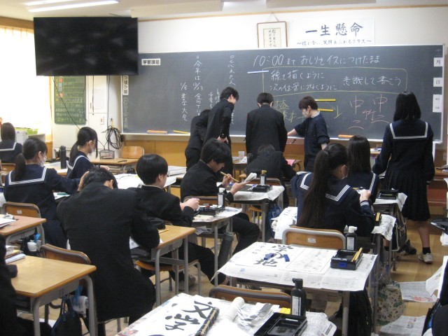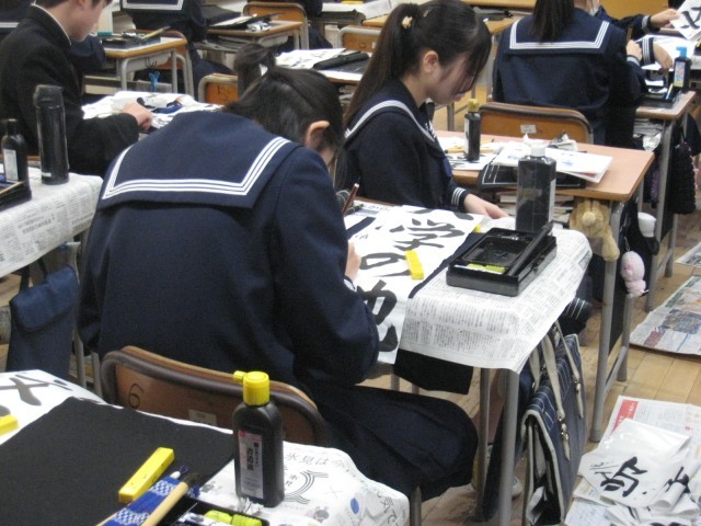 2年生の国語の授業では、書初め練習(2組)をしているクラスもあれば、百人一首(8組)をしているクラスもありました