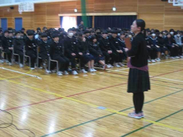 次に、担当教員から、冬休みの「学習」「生活」について話がありました。学習では、「時間や場所を決めること」、「こ こに進学したいという強い思いを持つこと」等が話され、生活では、「あたりまえのレベルを上げる」、「命を守る」「最悪の場合を想定しておく」等が話されました。