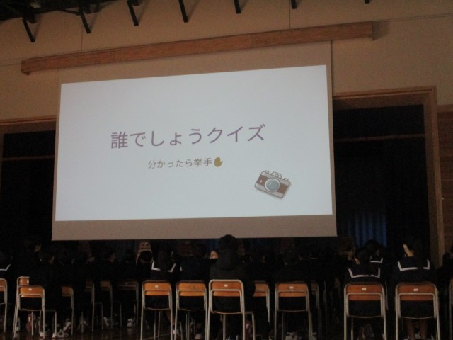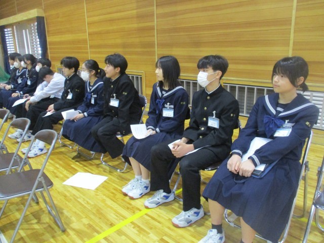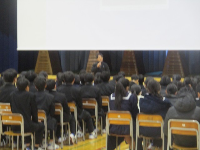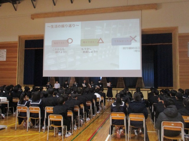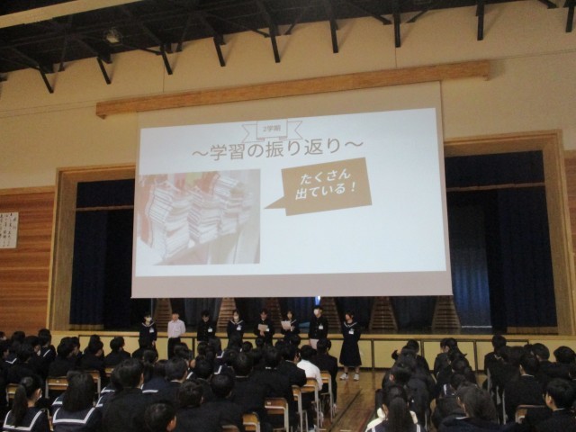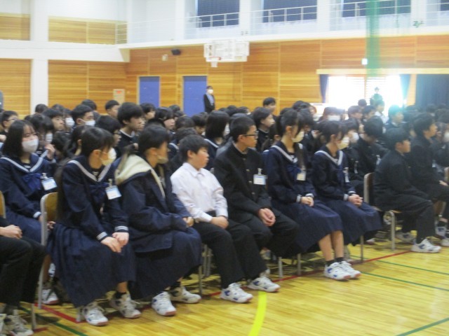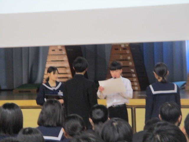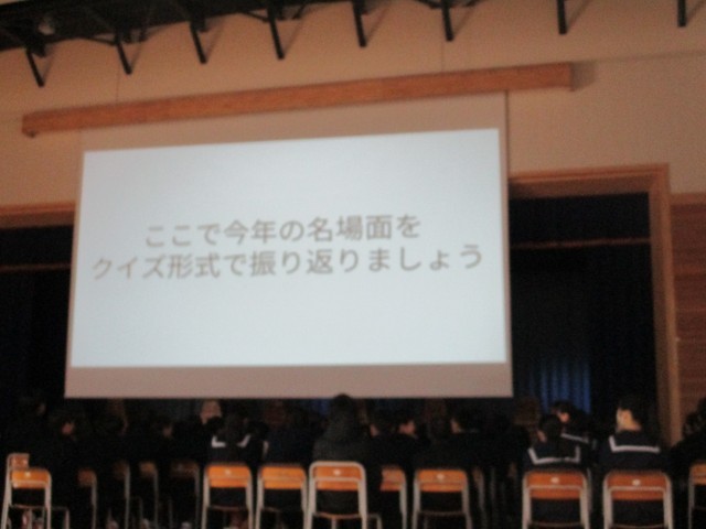 12月23日(火) 1年生 学年集会 公開日 2025/12/23 更新日 2025/12/23 1年生 2学期を振り返る学年集会がありました。 最初に、学年生徒会のメンバーから2学期を振り返りの発表があり、レクリエーションの優勝クラスの表彰が行われ、学年MVPも発表されました。 続いて、今年の名場面を振り返った『これは誰でしょう。クイズ』が行われ、とても和やかな雰囲気となりました。最後に先生方から、学習面・生活面についてのお話がありました。みん な、真剣な表情で耳を傾けていました。 +7