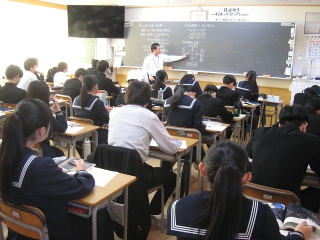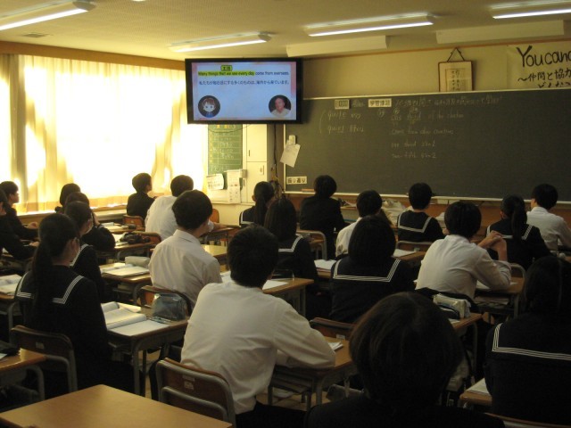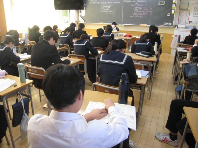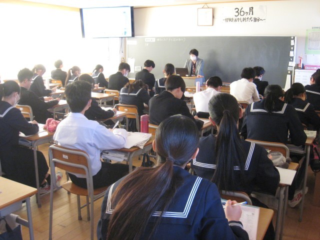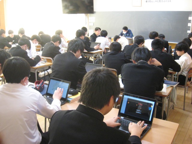 写真は、上から1組・2組保健体育、3組英語、4組社会、5組理科、6組英語、7組社会、8組理科の授業の様子です。