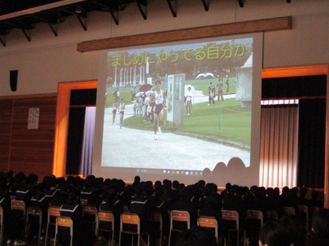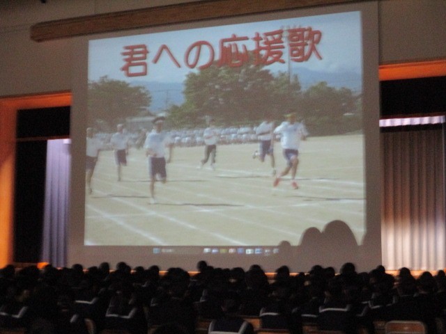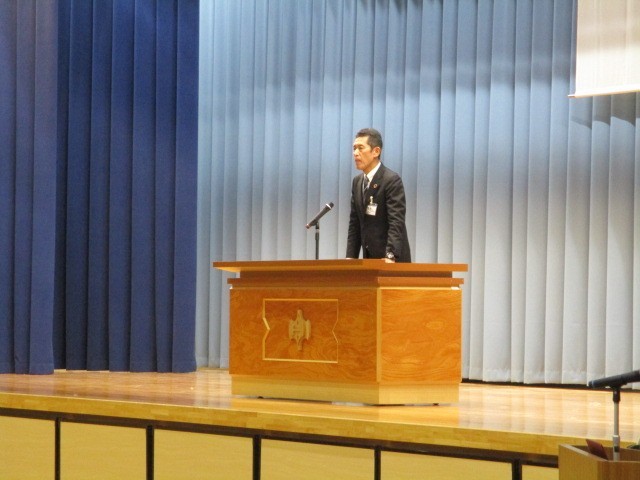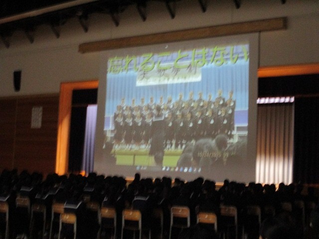 校訓唱和の後、終業式を行いました。鍋田校長は式辞で学習面等で向上したことや、冬休みの間に普段できないことに取り組み、自分を向上させてほしいと述べました。その後、2学期の様々な場面を振り返るスライドショーを上映しました。
