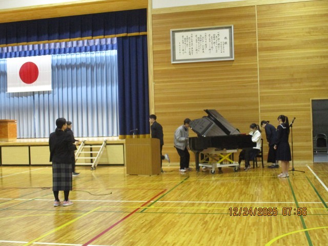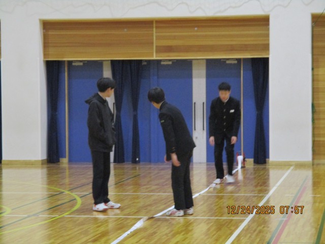 今日の終業式に向けての準備のため、3年生生徒が朝早くから会場づくりをしています。3学期からは、2年生にバトンタッチして引き継ぎます。これまで、準備してくれた3年生のみなさん、ありがとうございました。