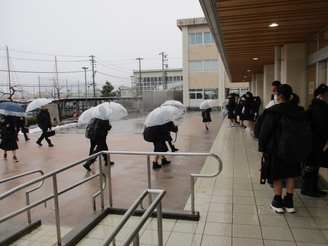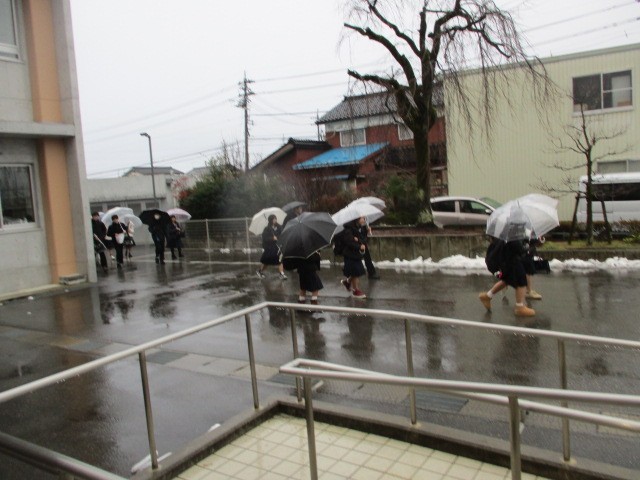 今朝の登校時は雨になりました。今日は2学期始業式と書初大会を行います。本日の下校完了時間は11:45です。