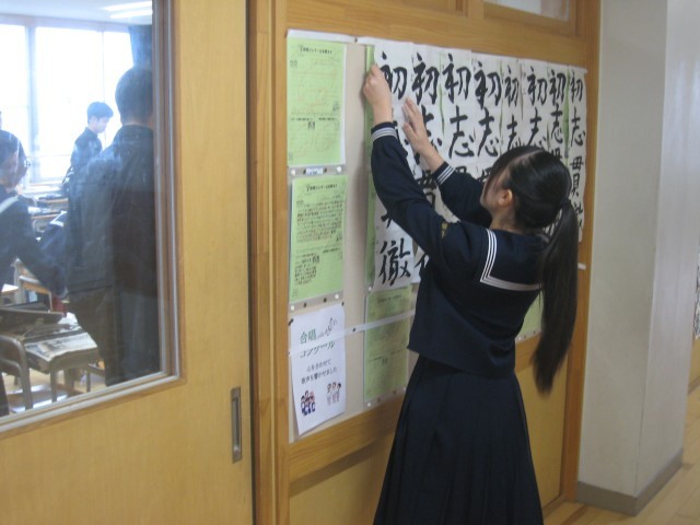 始業式の後、各教室で書初大会が行われました。3年生は行書で「初志貫徹」と書きました。心を込めて書き、廊下に掲示しました。