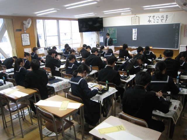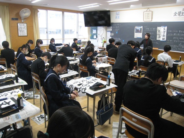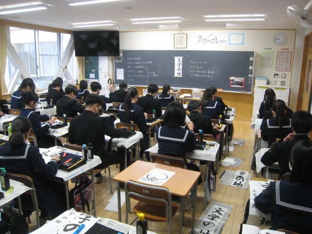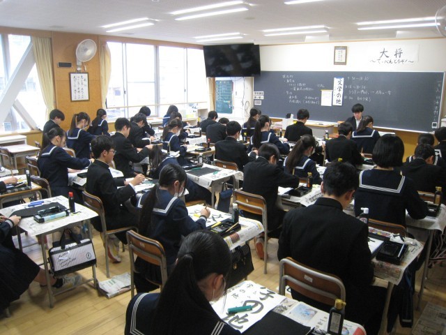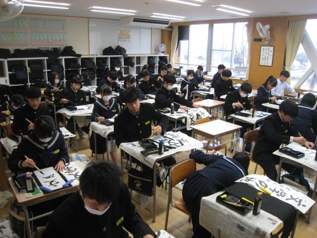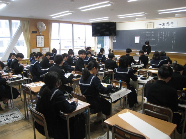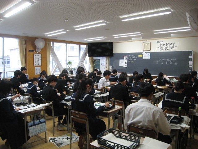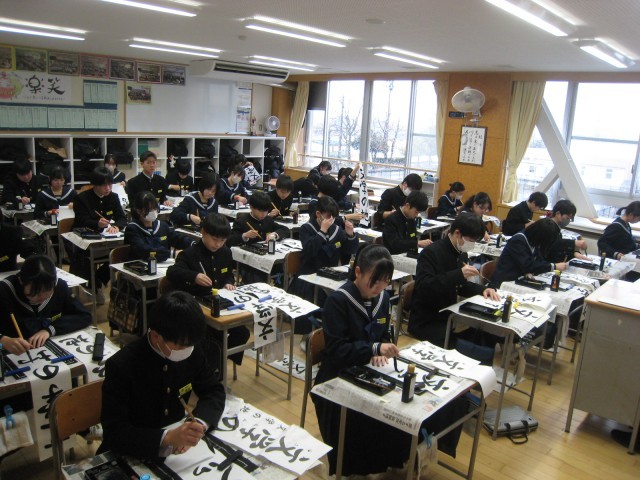 2年生の書初大会の様子です。2年生は「文学の地」と行書で書いていました。教室の中はシーンと静まり返っており、静粛な雰囲気の中で課題に取り組んでいました。