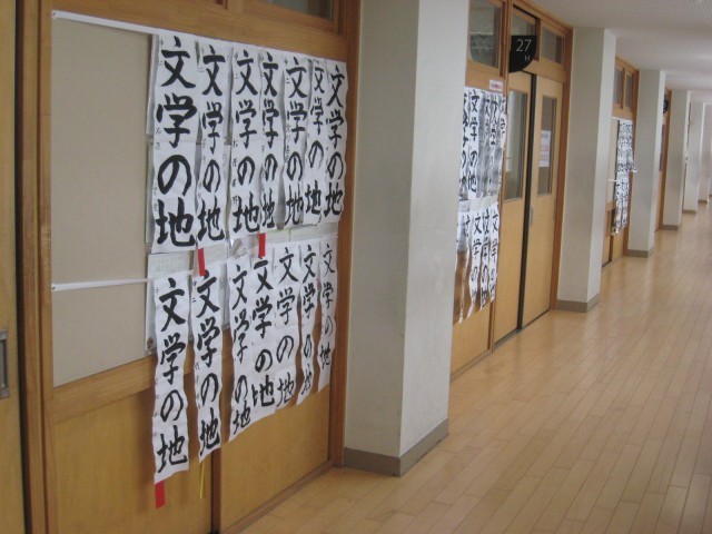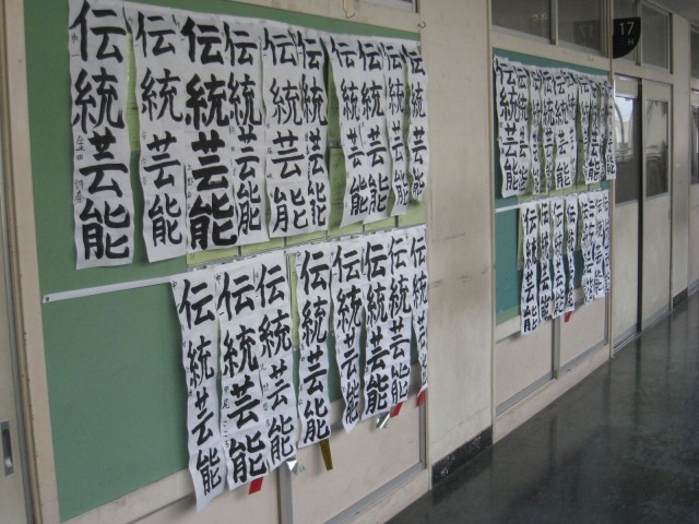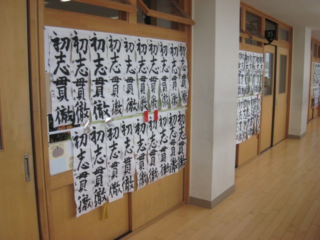 昨日の書初大会の作品が教室前に掲示され、入賞者には金紙、銀紙、赤紙が取り付けられていました。